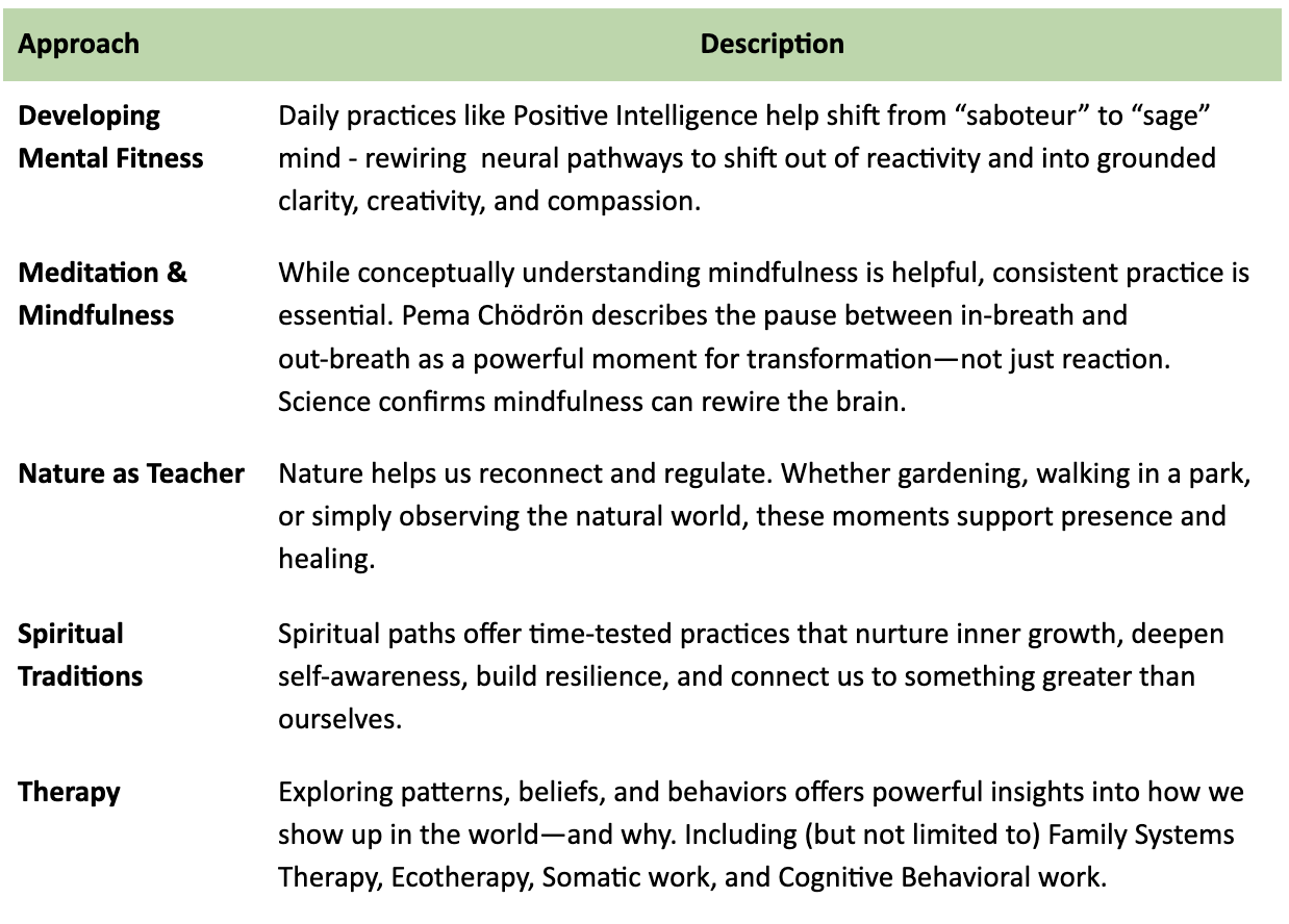 Having a deep understanding of our inner dynamics—values, biases, emotional triggers, past traumas, and patterns of behavior — can help surface “blind spots,” “saboteurs,” and “shadow” selves. Self-reflection provides insight into how to show up differently and move through these stages of awareness. It also provides an opportunity to learn to respond rather than react – fostering healthy relationships that can support the greater good, and long-term, meaningful change.