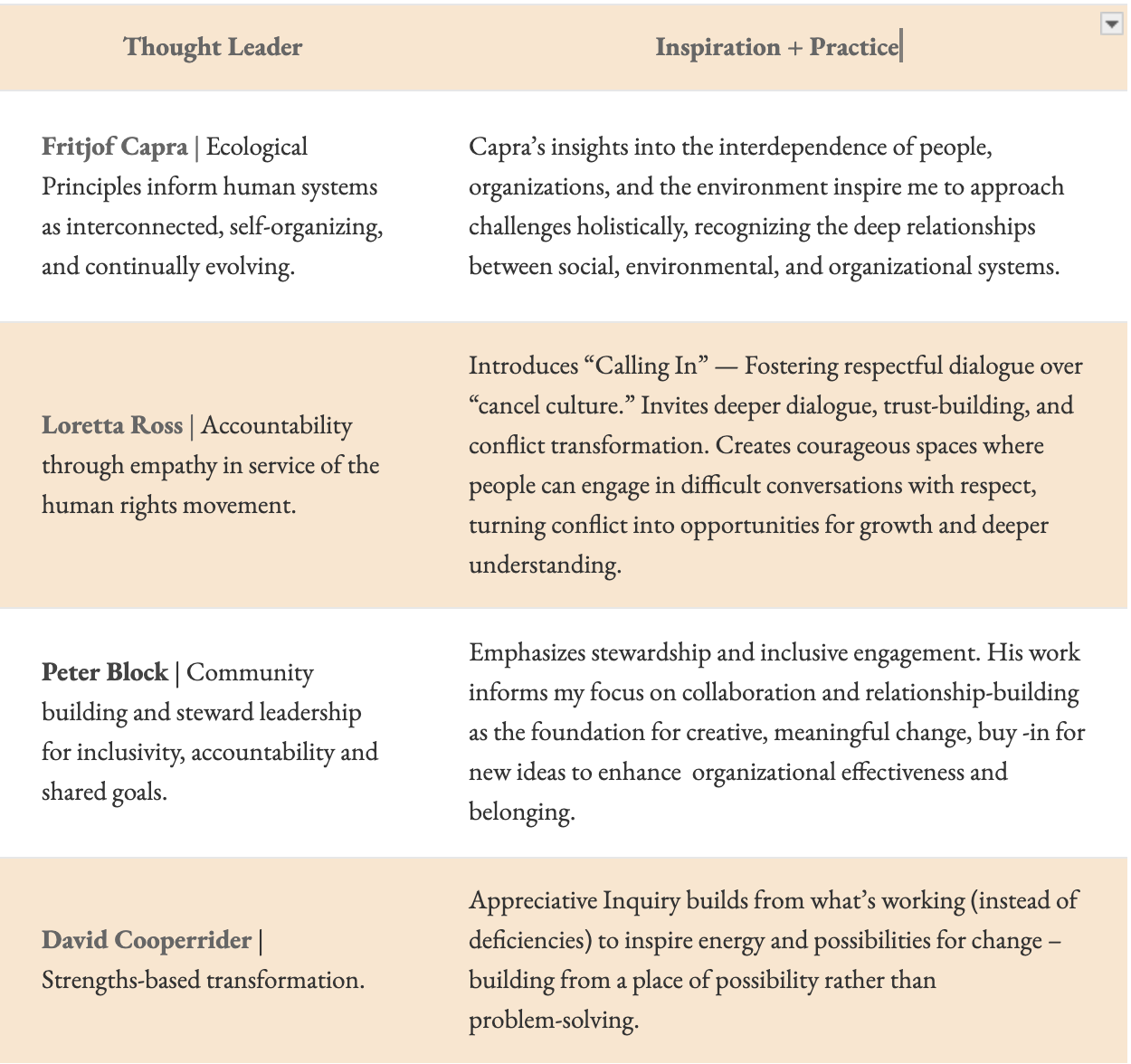 Together, these thought leaders inspire my systems-centered, restorative approach to change, where communities and organizations thrive by honoring relationships, fostering accountability, and working in alignment with our interconnected world.