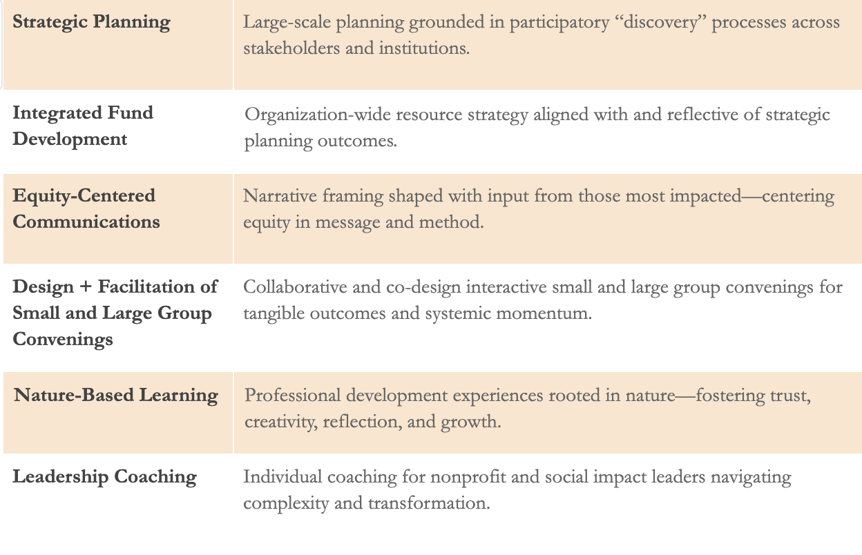 My consulting practice is relational, collaborative, and multi-faceted, grounded in years of work as an organization development practitioner, fundraiser, and strategist. This approach is further informed by my leadership as a former nonprofit Founder and Executive Director.